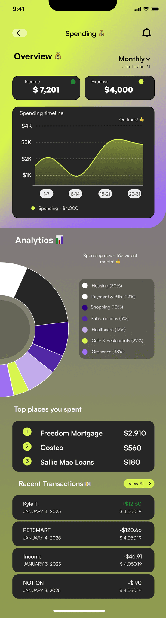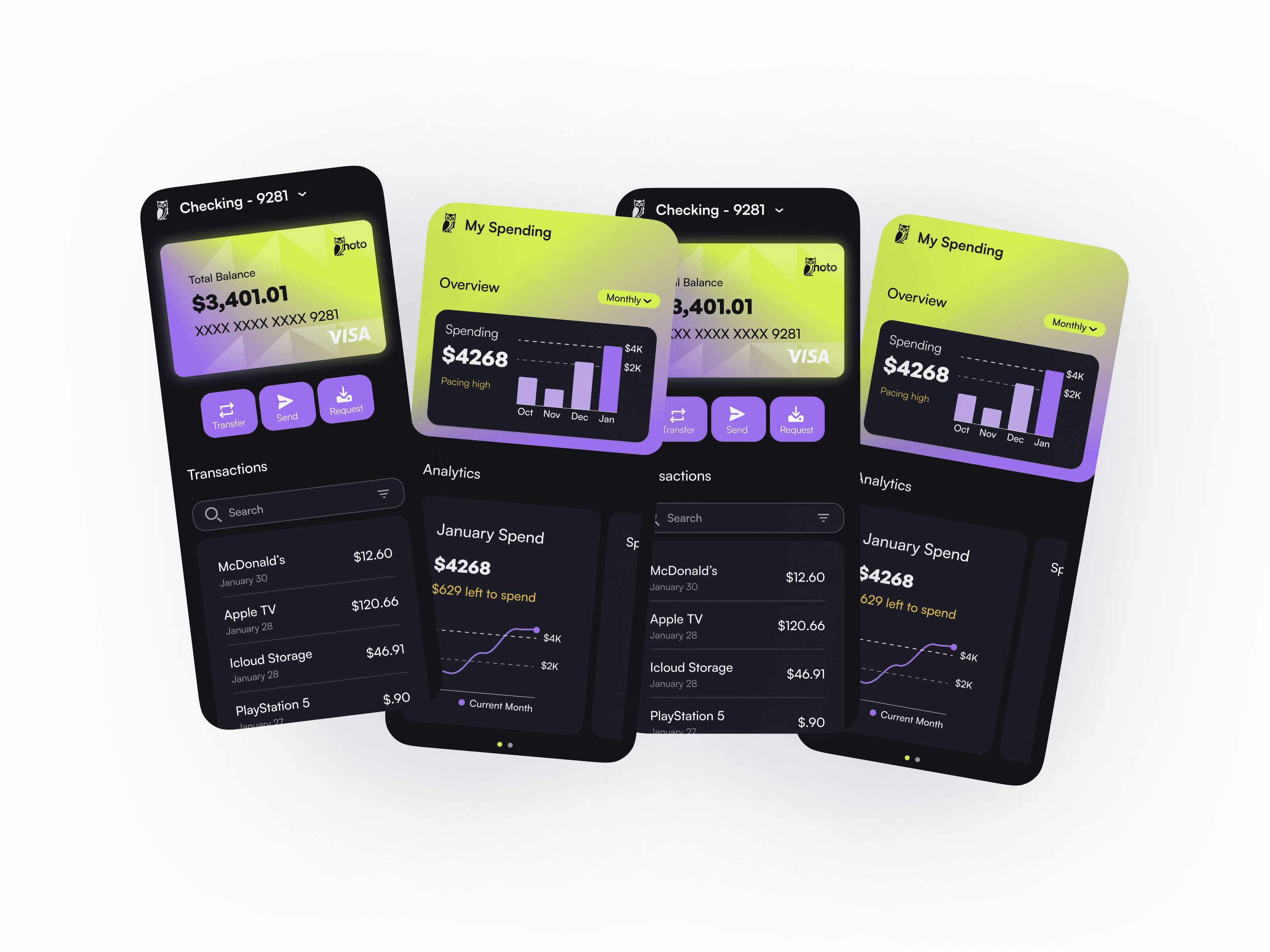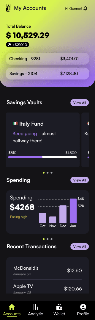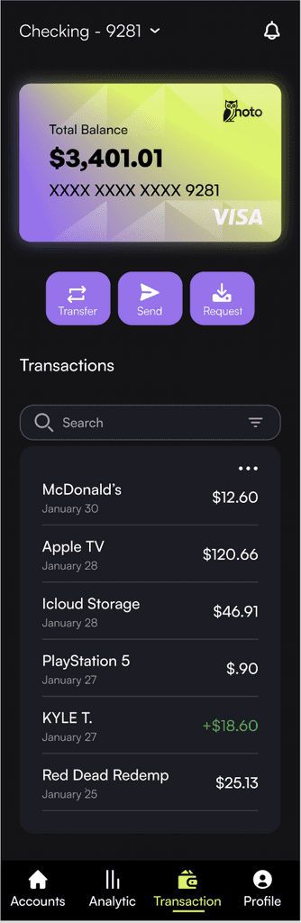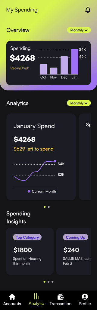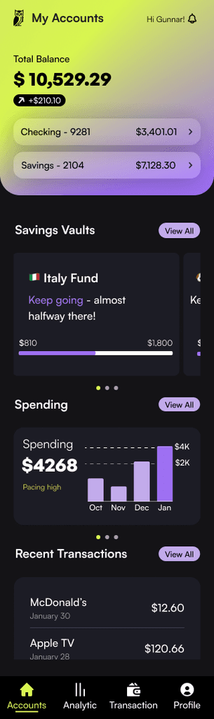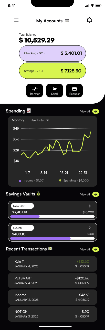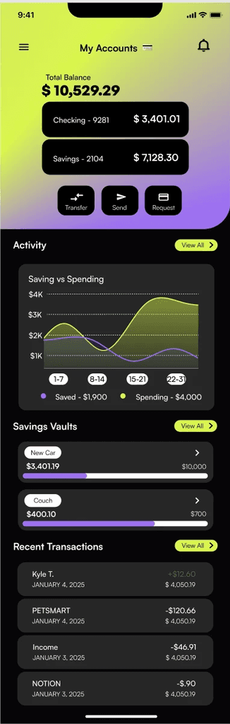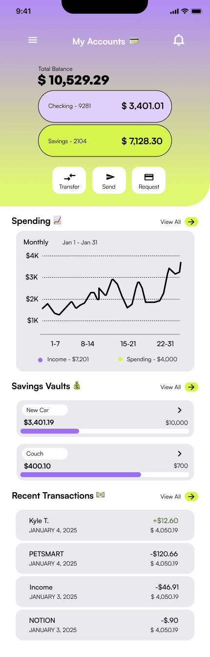 Initially, I tested a predominantly blue palette a color often associated with trust. However, it felt too similar to other banking apps like Chase and SoFi, which rely heavily on blue as a primary accent.